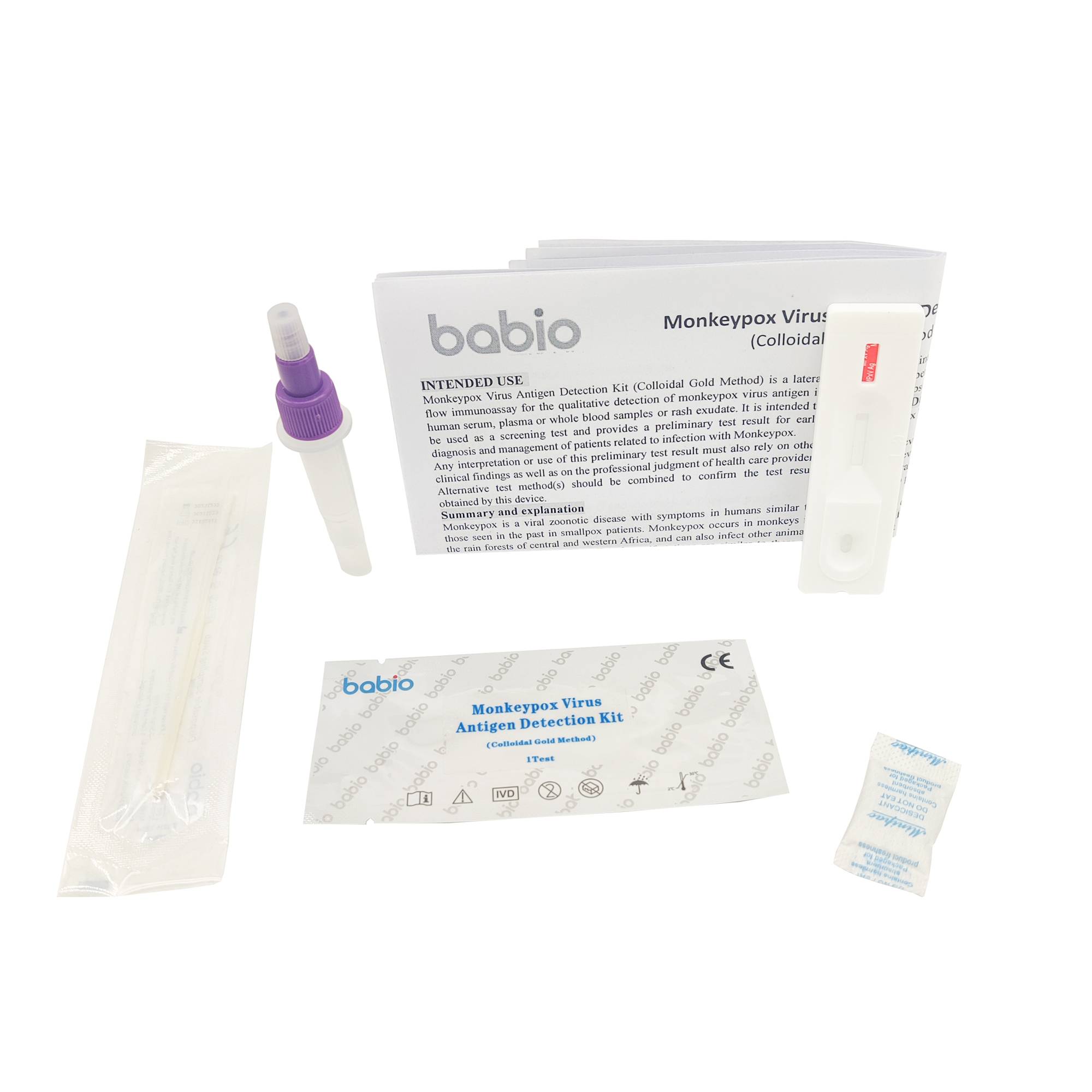 Monkeypox Virus Antigen Detection Kit (Colloidal Gold Method) သည် လူ့သွေးရည်ကြည်၊ ပလာစမာ သို့မဟုတ် သွေးနမူနာတစ်ခုလုံး သို့မဟုတ် အဖုအထွက်များသည့် မျောက်ကျောက်ဗိုင်းရပ်စ် အန်တီဂျင်၏ အရည်အသွေးကို ရှာဖွေတွေ့ရှိရန်အတွက် ဘေးထွက်စီးဆင်းမှု immunoassay တစ်ခုဖြစ်သည်။ ၎င်းအား စစ်ဆေးမှုတစ်ခုအဖြစ် အသုံးပြုရန် ရည်ရွယ်ပြီး Monkeypox နှင့်ဆက်စပ်သော လူနာများ၏ အစောပိုင်းရောဂါရှာဖွေခြင်းနှင့် စီမံခန့်ခွဲမှုအတွက် ပဏာမစမ်းသပ်မှုရလဒ်ကို ပံ့ပိုးပေးပါသည်။